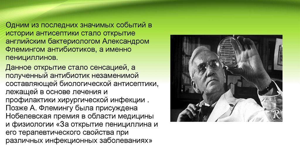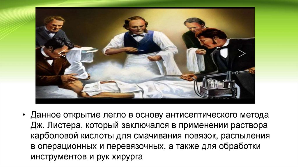 • Данное открытие легло в основу антисептического методаДж. Листера, который заключался в применении раствора