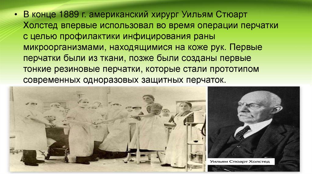 • В конце 1889 г. американский хирург Уильям СтюартХолстед впервые использовал во время операции перчатки