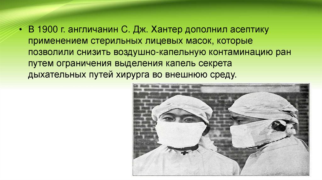 • В 1900 г. англичанин C. Дж. Хантер дополнил асептикуприменением стерильных лицевых масок, которые