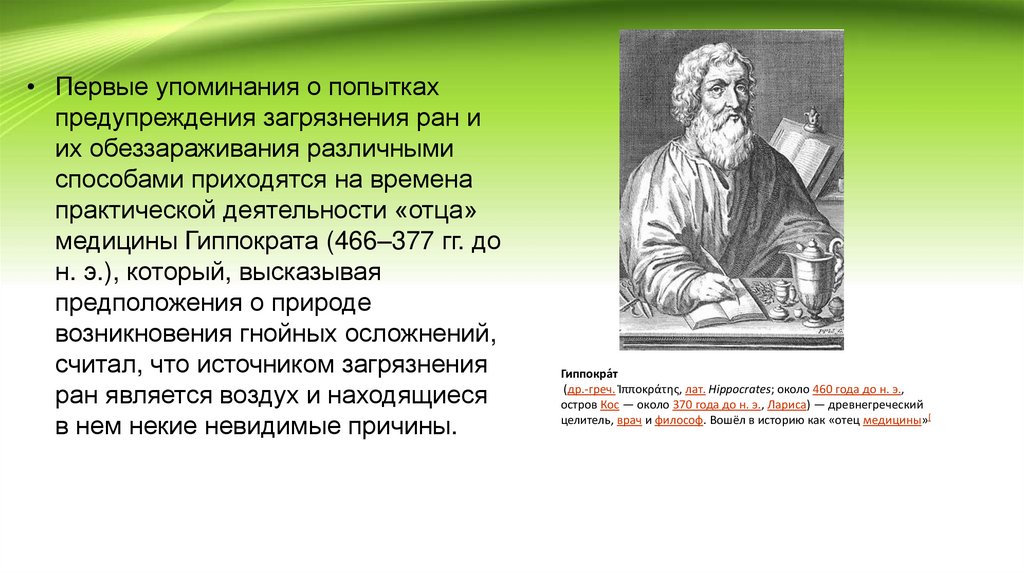 • Первые упоминания о попыткахпредупреждения загрязнения ран и