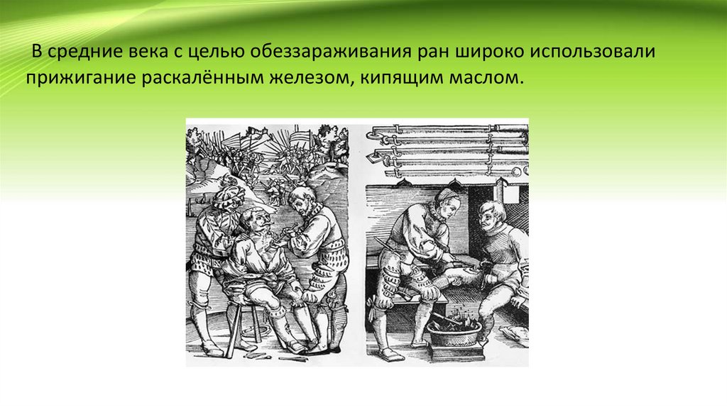 В средние века с целью обеззараживания ран широко использовалиприжигание раскалённым железом, кипящим маслом.