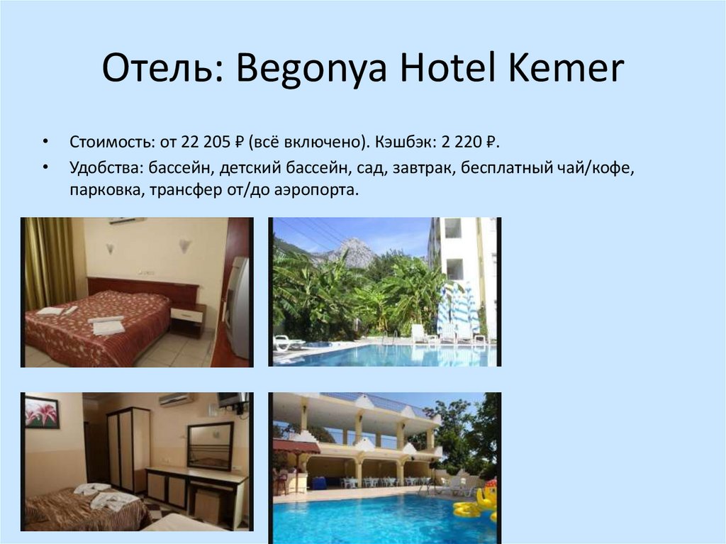 Отель: Begonya Hotel KemerСтоимость: от 22 205 ₽ (всё включено). Кэшбэк: 2 220 ₽.