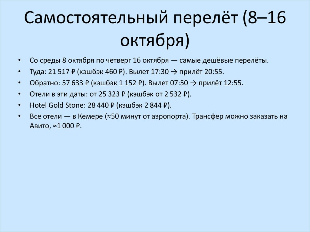 Со среды 8 октября по четверг 16 октября — самые дешёвые перелёты.