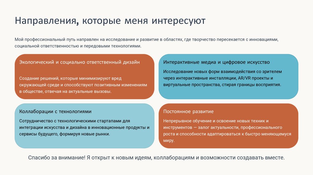 Направления, которые меня интересуютМой профессиональный путь направлен на исследование и развитие в областях, где творчество пересекается с инновациями,