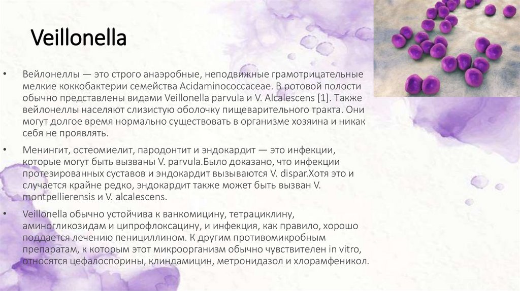 обычно представлены видами Veillonella parvula и V. Alcalescens [1]. Также