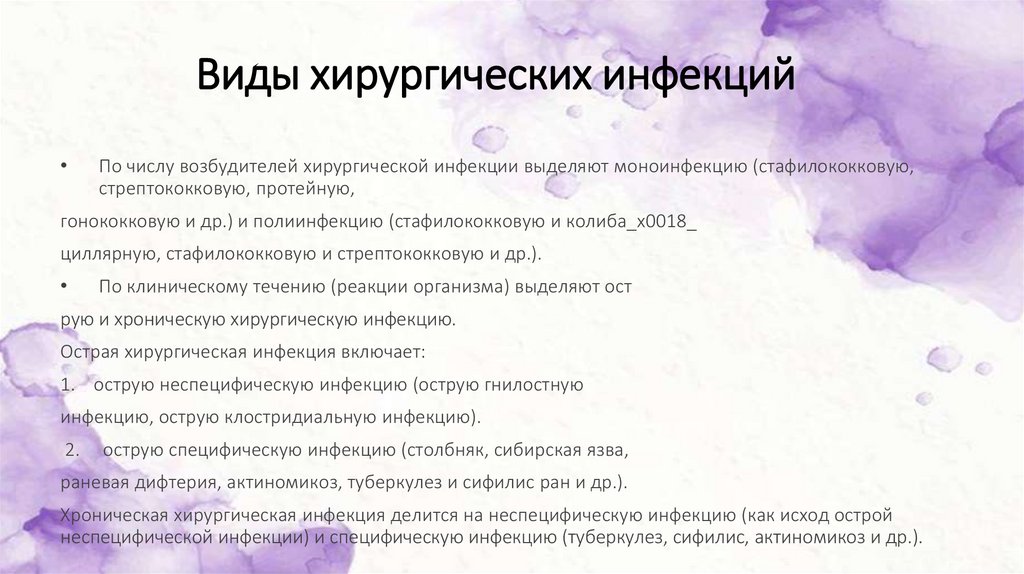 Виды хирургических инфекцийПо числу возбудителей хирургической инфекции выделяют моноинфекцию (стафилококковую,