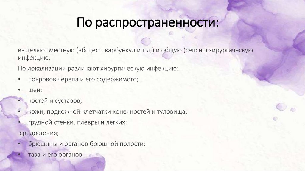 По распространенности:выделяют местную (абсцесс, карбункул и т.д.) и общую (сепсис) хирургическую