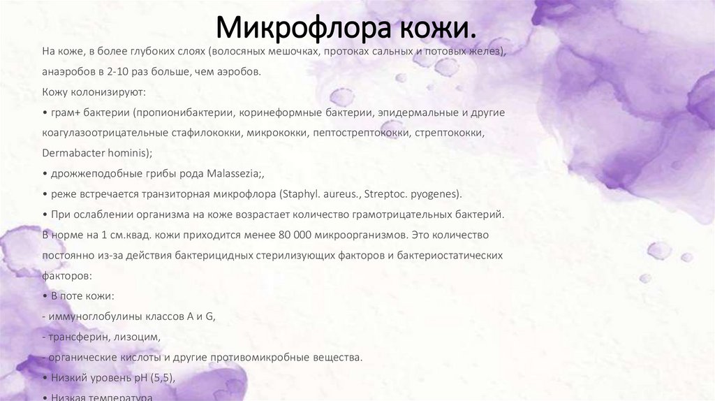 Микрофлора кожи.На коже, в более глубоких слоях (волосяных мешочках, протоках сальных и потовых желез),