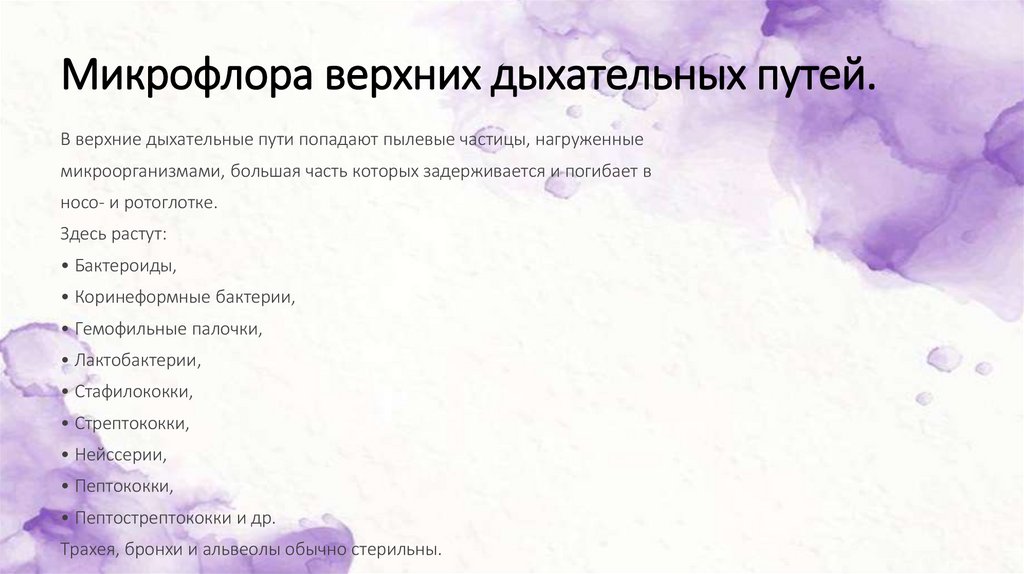 Микрофлора верхних дыхательных путей.В верхние дыхательные пути попадают пылевые частицы, нагруженные