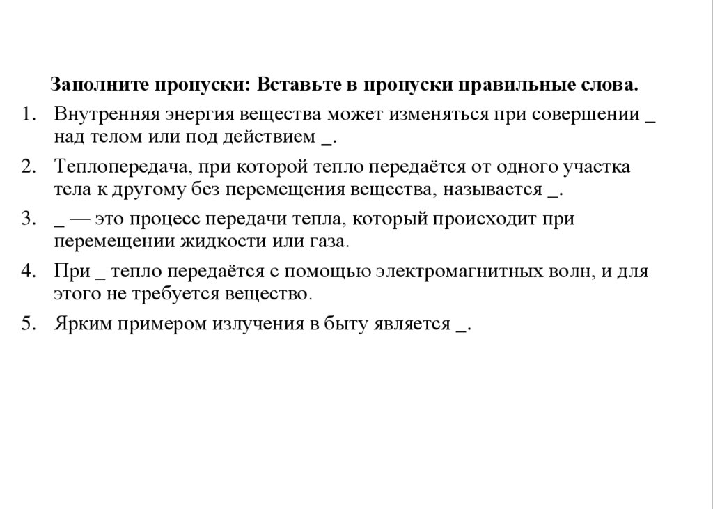 Заполните пропуски: Вставьте в пропуски правильные слова.1. Внутренняя энергия вещества может изменяться при совершении _