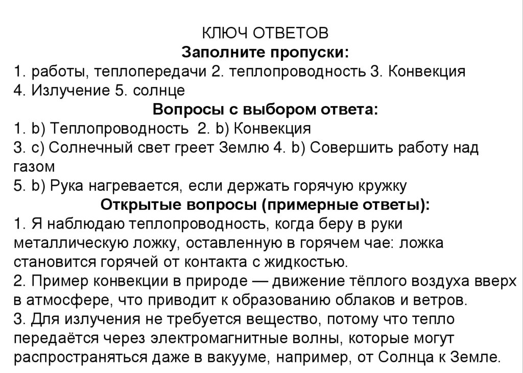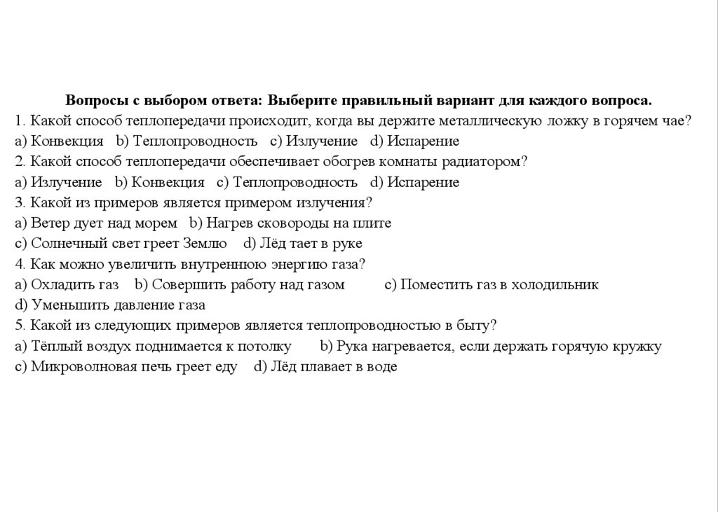 Вопросы с выбором ответа: Выберите правильный вариант для каждого вопроса.1. Какой способ теплопередачи происходит, когда вы держите металлическую ложку в горячем чае?