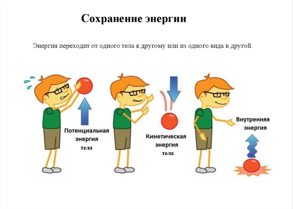 Сохранение энергииЭнергия переходит от одного тела к другому или из одного вида в другой.