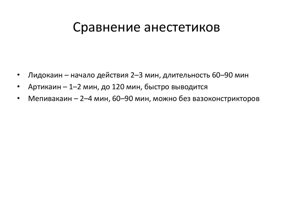 Сравнение анестетиков• Лидокаин – начало действия 2–3 мин, длительность 60–90 мин