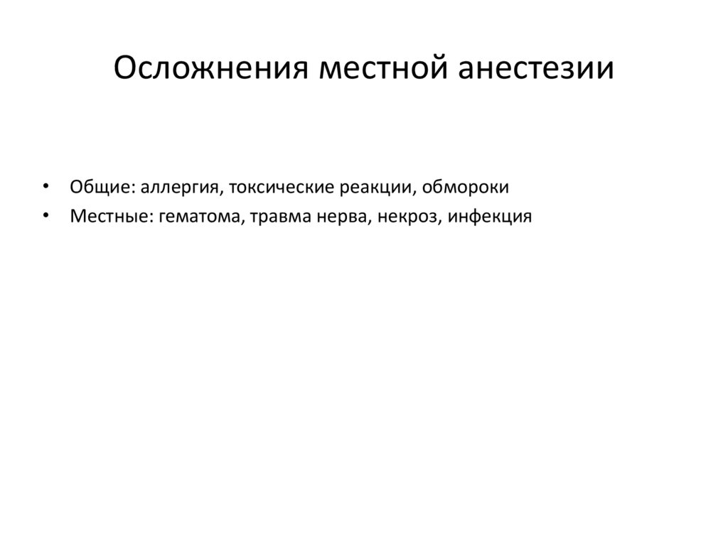 Осложнения местной анестезии• Общие: аллергия, токсические реакции, обмороки