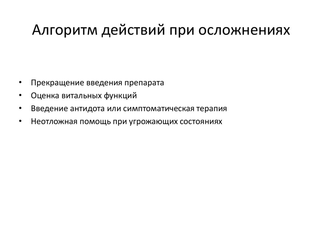Алгоритм действий при осложненияхПрекращение введения препарата