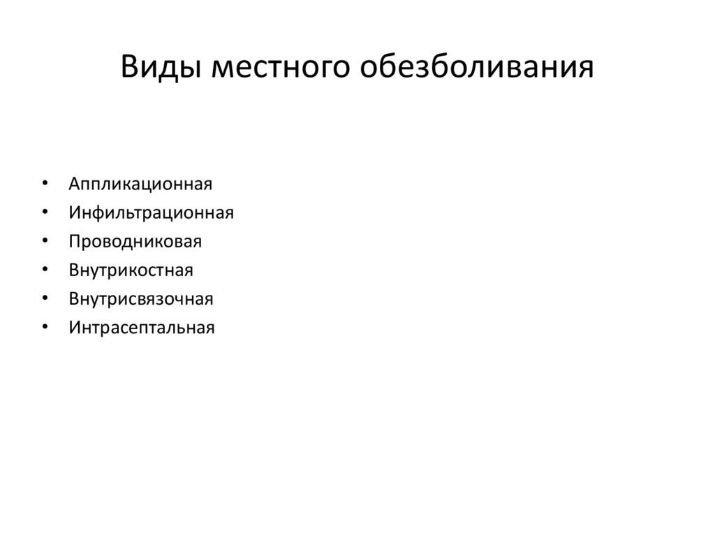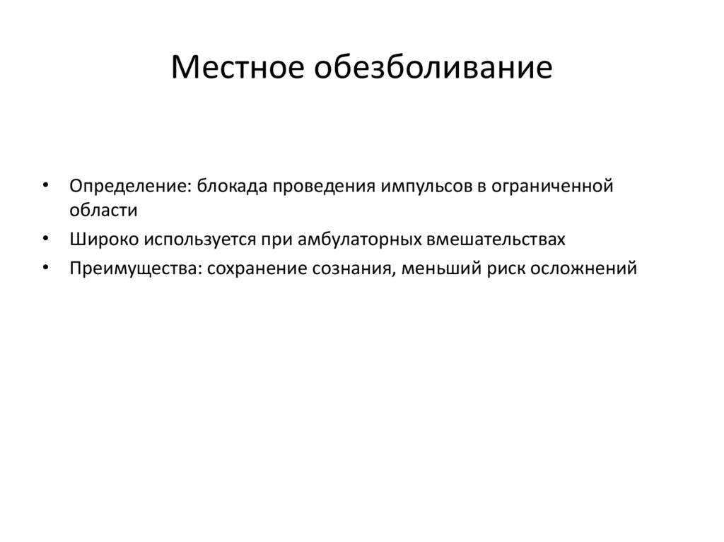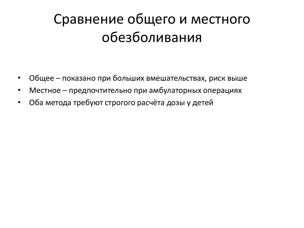 • Местное – предпочтительно при амбулаторных операциях