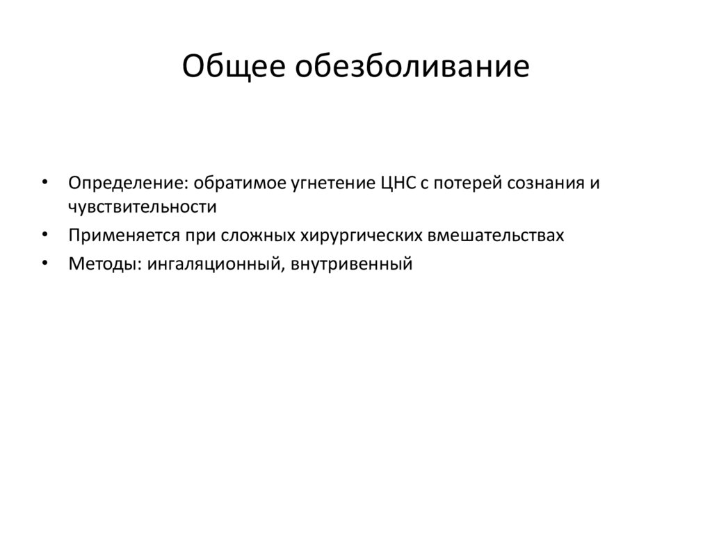 Общее обезболивание• Определение: обратимое угнетение ЦНС с потерей сознания и
