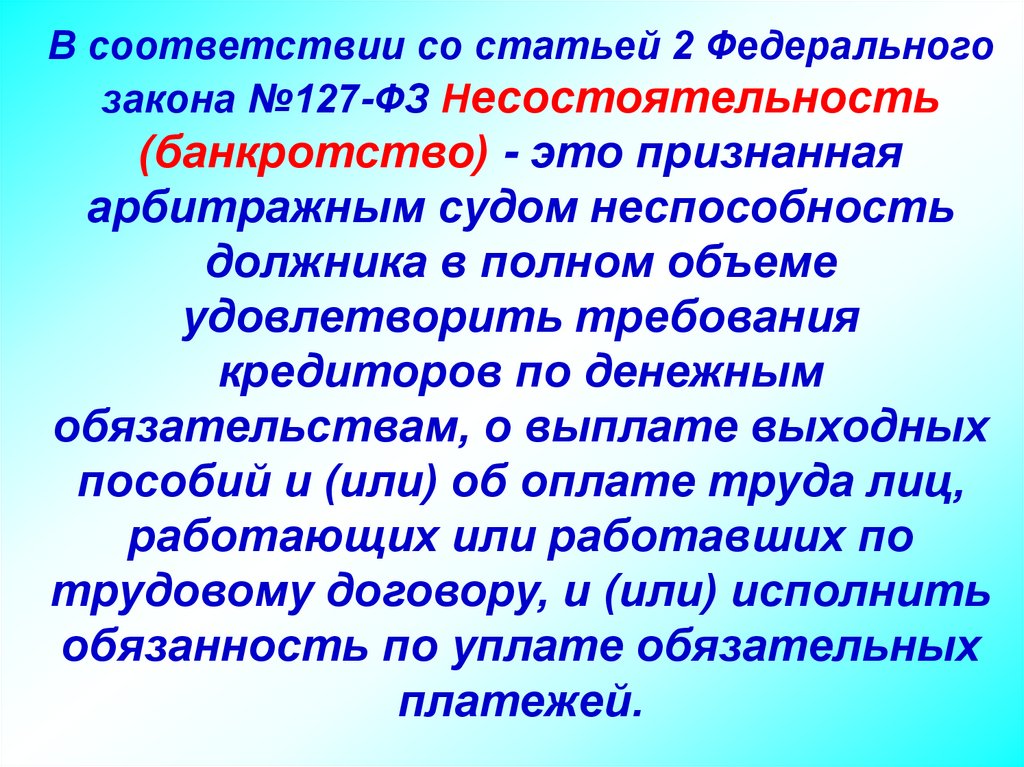 В соответствии со статьей 2 Федеральногозакона №127-ФЗ Несостоятельность