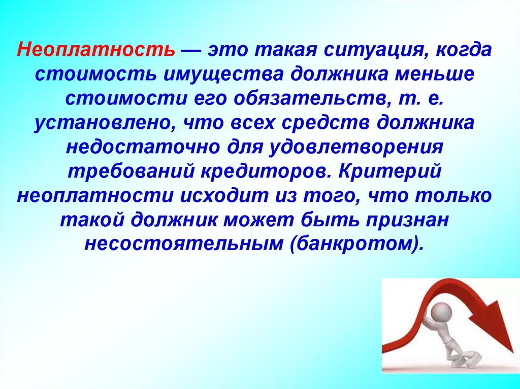 Неоплатность — это такая ситуация, когдастоимость имущества должника меньше