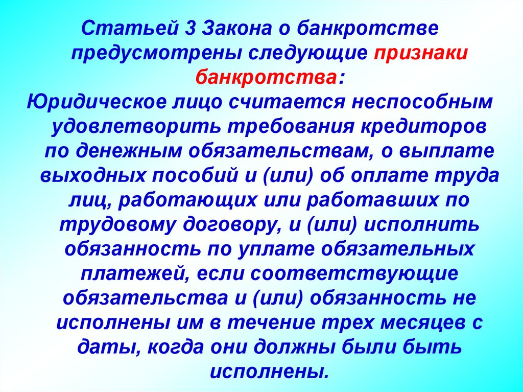 Статьей 3 Закона о банкротствепредусмотрены следующие признаки