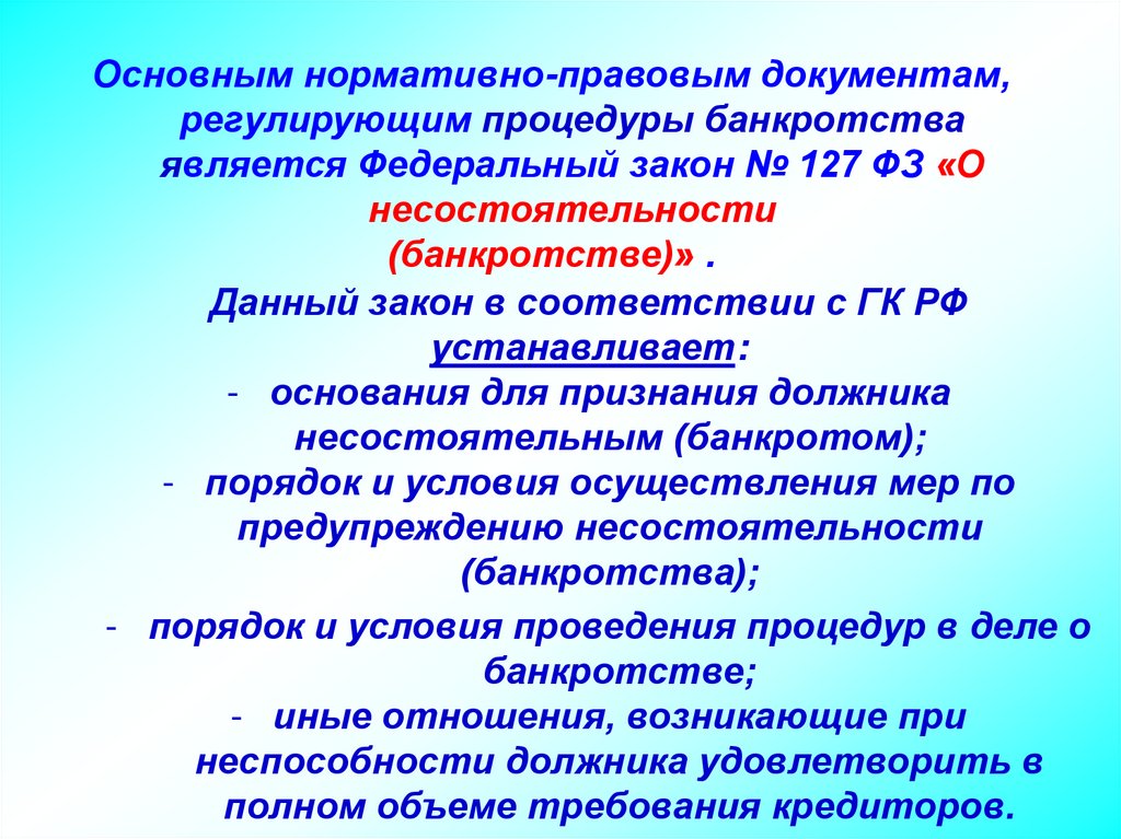 Основным нормативно-правовым документам,регулирующим процедуры банкротства