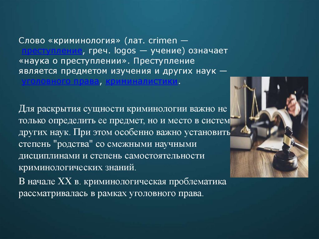 Слово «криминология» (лат. crimen —преступление, греч. logos — учение) означает
