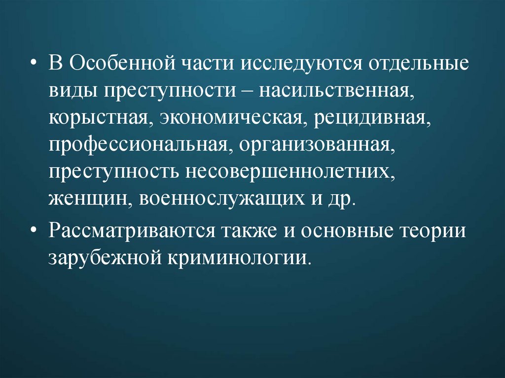 • В Особенной части исследуются отдельныевиды преступности – насильственная,