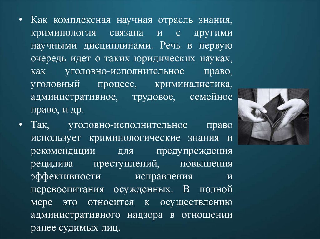 • Как комплексная научная отрасль знания,криминология связана и с другими