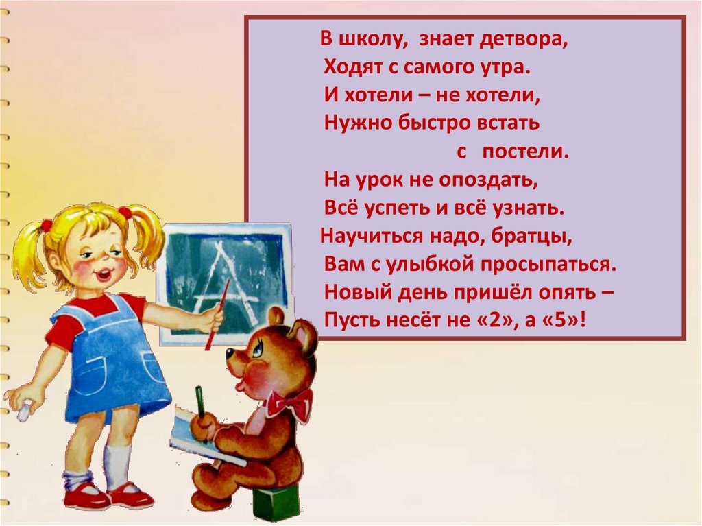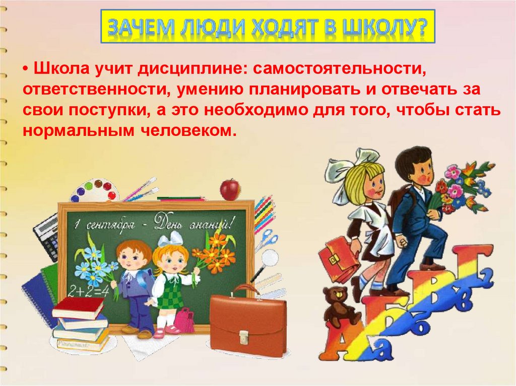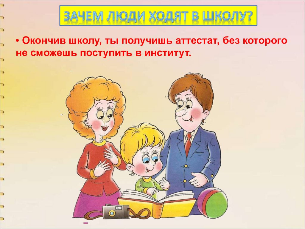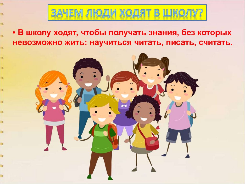 • В школу ходят, чтобы получать знания, без которыхневозможно жить: научиться читать, писать, считать.