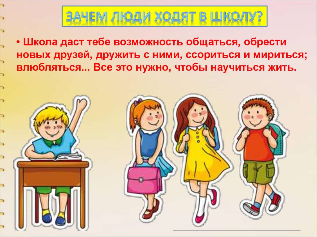 • Школа даст тебе возможность общаться, обрестиновых друзей, дружить с ними, ссориться и мириться;