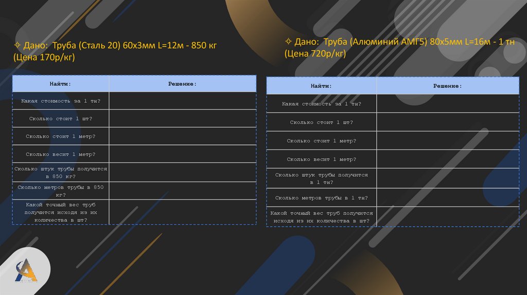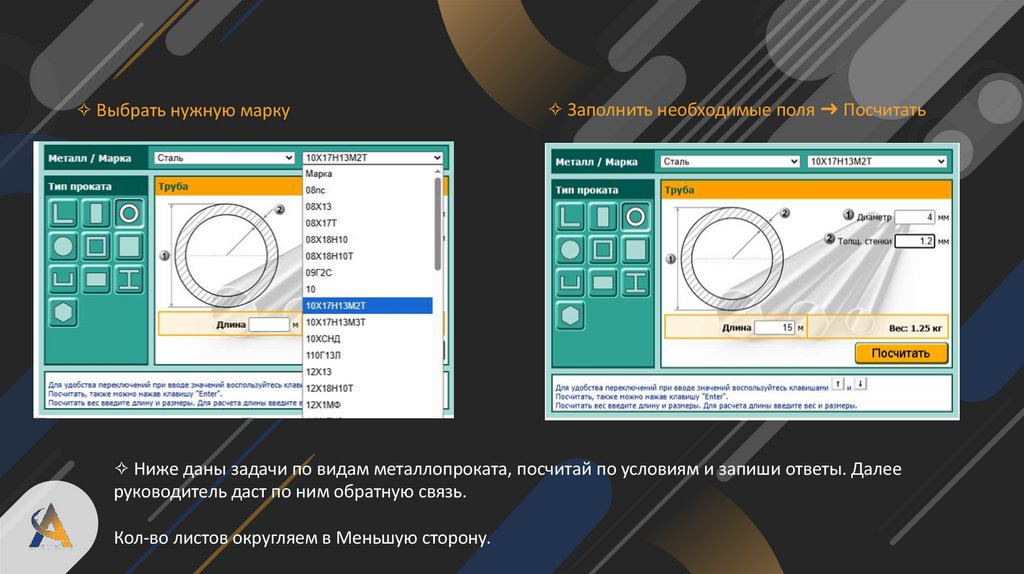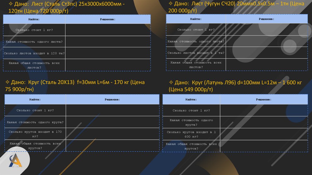 ✧ Ниже даны задачи по видам металлопроката, посчитай по условиям и запиши ответы. Далее