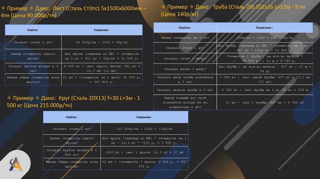 ✧ Пример ✧ Дано: Лист (Сталь Ст3пс) 5х1500х6000мм –4тн (Цена 90 000р/тн)