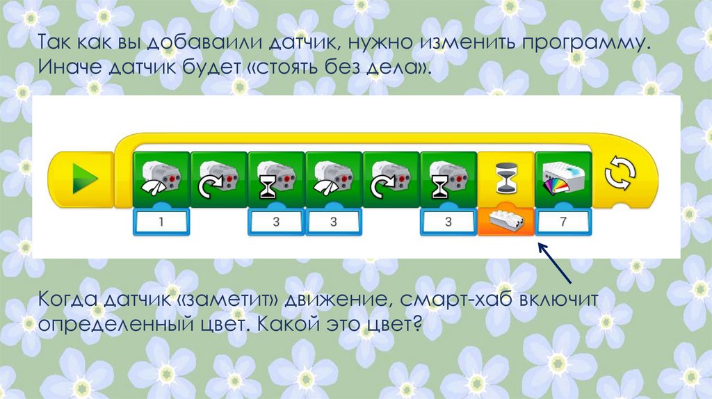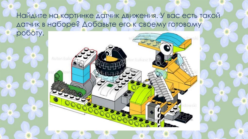 Найдите на картинке датчик движения. У вас есть такойдатчик в наборе? Добавьте его к своему готовому