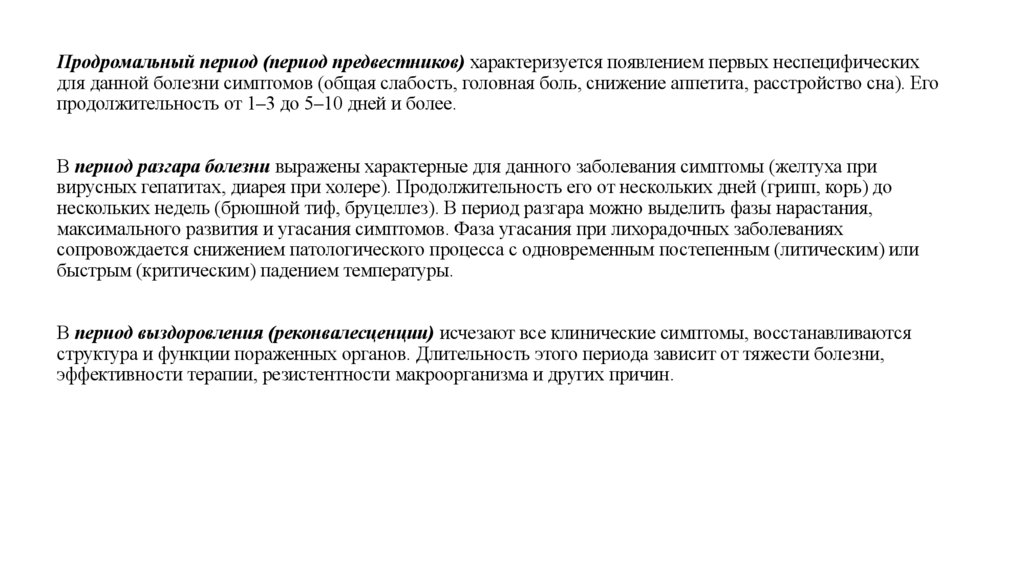 вирусных гепатитах, диарея при холере). Продолжительность его от нескольких дней (грипп, корь) до