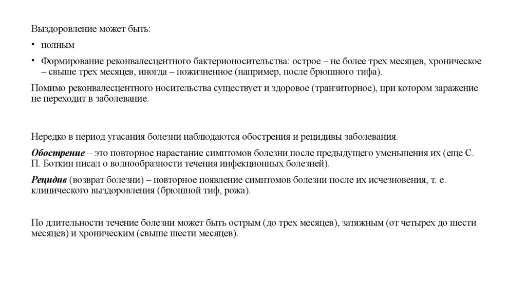• Формирование реконвалесцентного бактерионосительства: острое – не более трех месяцев, хроническое