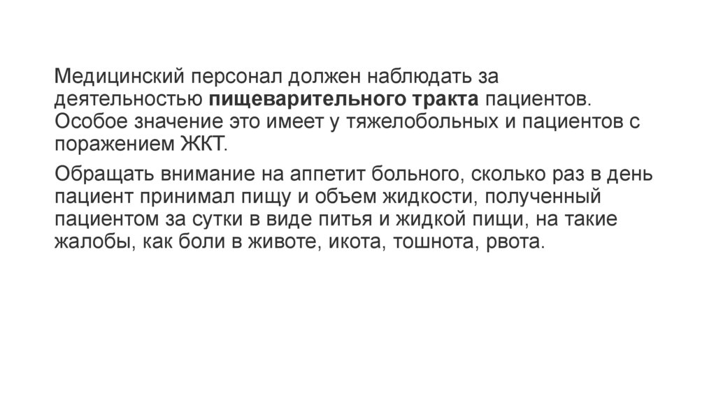 Медицинский персонал должен наблюдать задеятельностью пищеварительного тракта пациентов.
