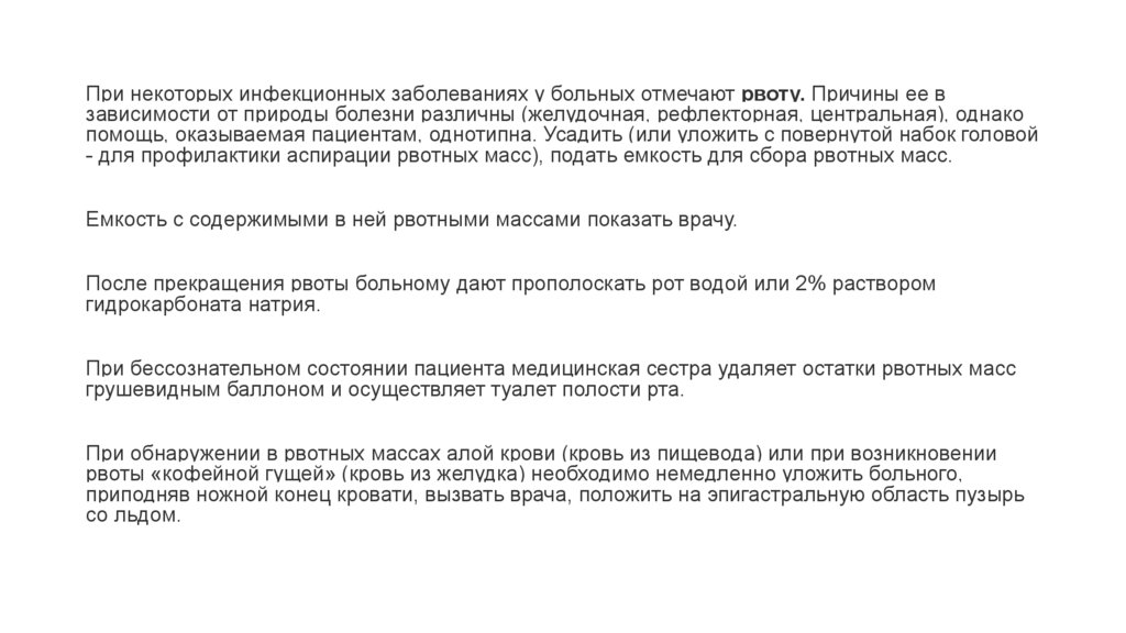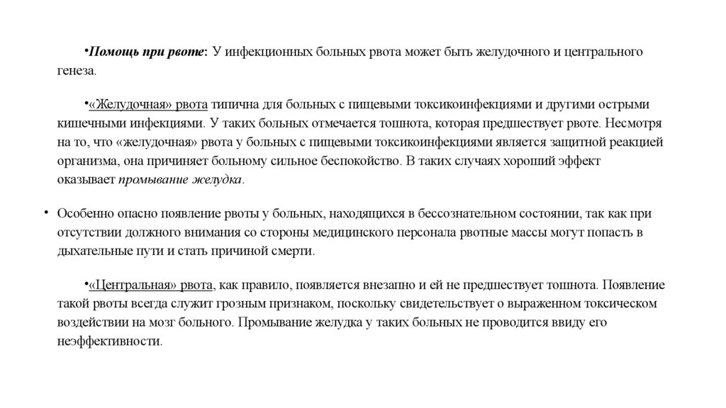 •Помощь при рвоте: У инфекционных больных рвота может быть желудочного и центральногогенеза.