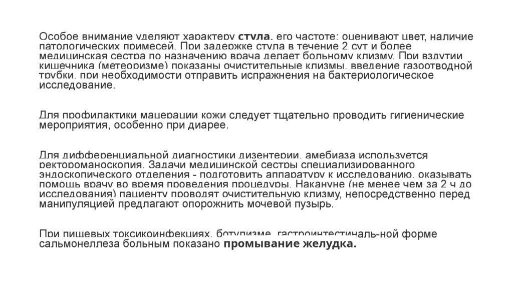 Особое внимание уделяют характеру стула, его частоте; оценивают цвет, наличиепатологических примесей. При задержке стула в течение 2 сут и более