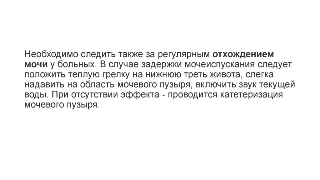 Необходимо следить также за регулярным отхождениеммочи у больных. В случае задержки мочеиспускания следует