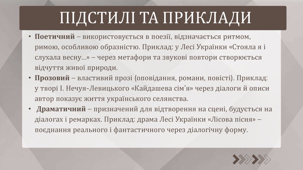 ПІДСТИЛІ ТА ПРИКЛАДИ• Поетичний – використовується в поезії, відзначається ритмом,