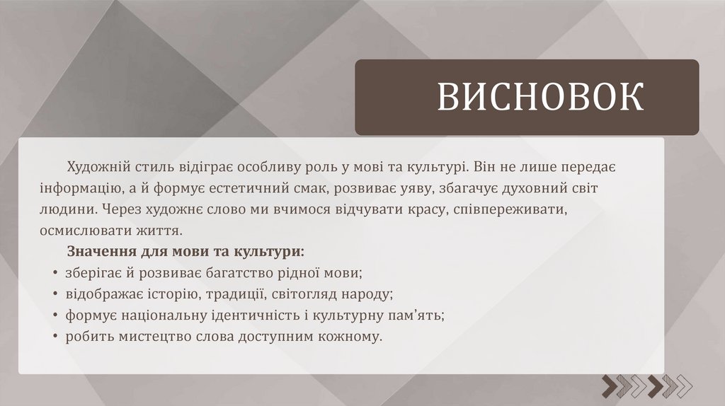ВИСНОВОКХудожній стиль відіграє особливу роль у мові та культурі. Він не лише передає