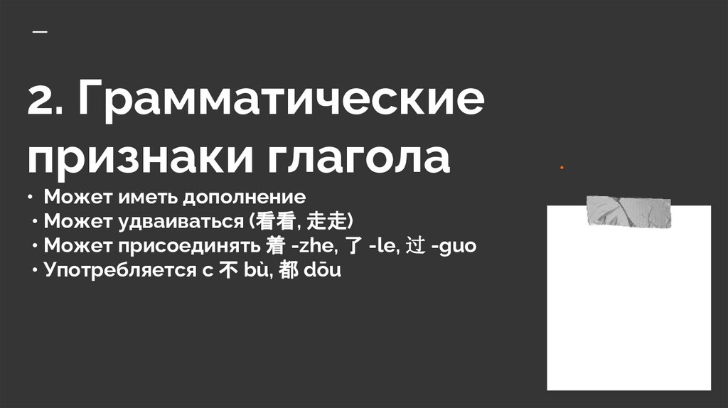 • Может присоединять 着 -zhe, 了 -le, 过 -guo
