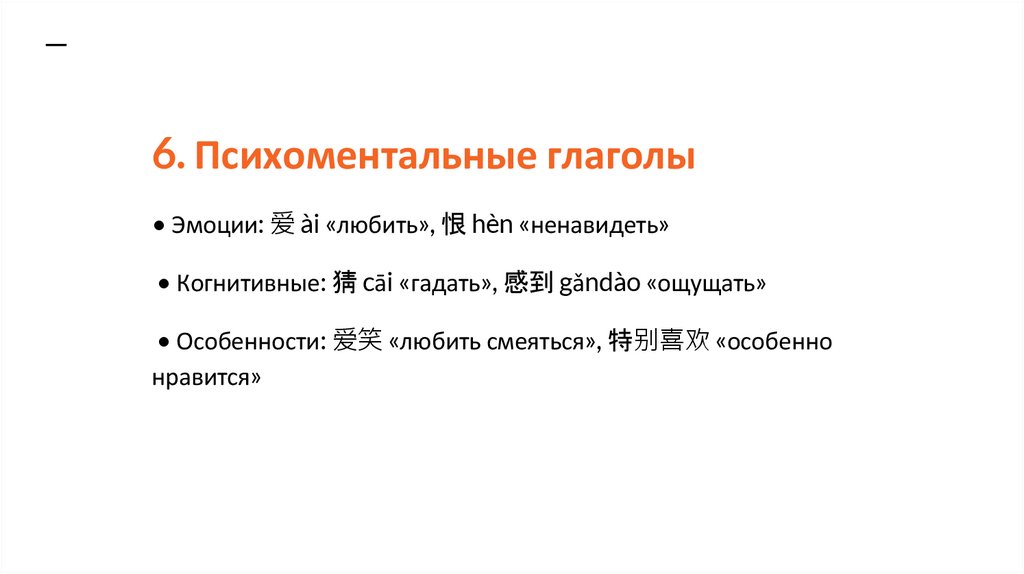 6. Психоментальные глаголы• Эмоции: 爱 ài «любить», 恨 hèn «ненавидеть»