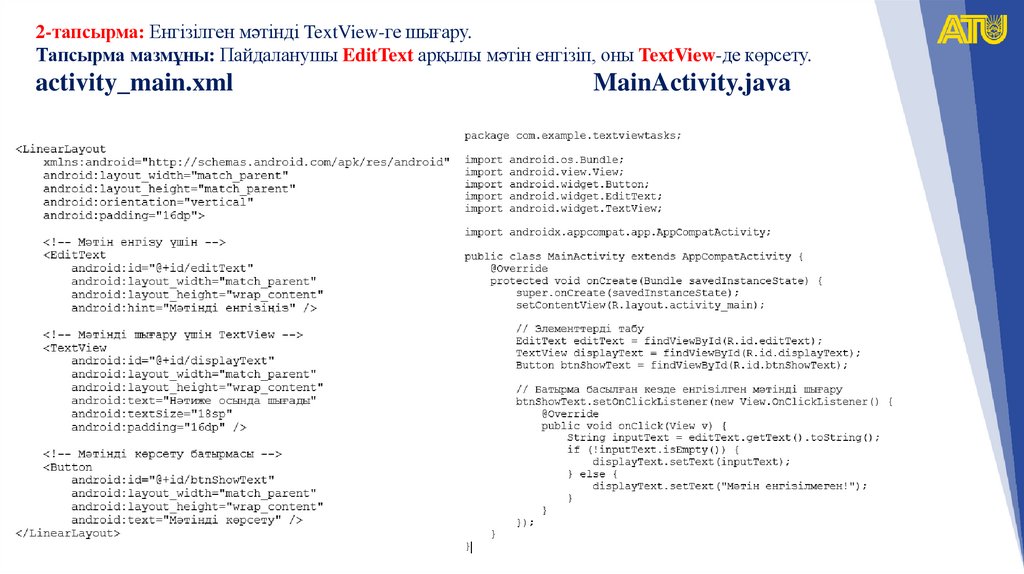 2-тапсырма: Енгізілген мәтінді TextView-ге шығару.Тапсырма мазмұны: Пайдаланушы EditText арқылы мәтін енгізіп, оны TextView-де көрсету.