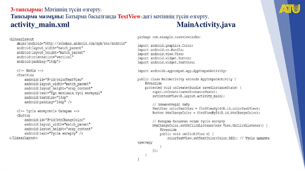 3-тапсырма: Мәтіннің түсін өзгерту.Тапсырма мазмұны: Батырма басылғанда TextView-дегі мәтіннің түсін өзгерту.
