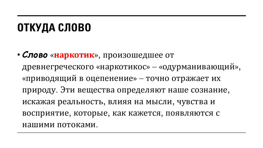 ОТКУДА СЛОВО• Слово «наркотик», произошедшее от