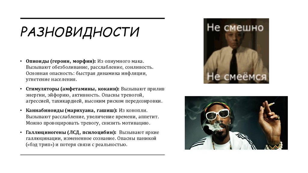 РАЗНОВИДНОСТИ• Опиоиды (героин, морфин): Из опиумного мака.
