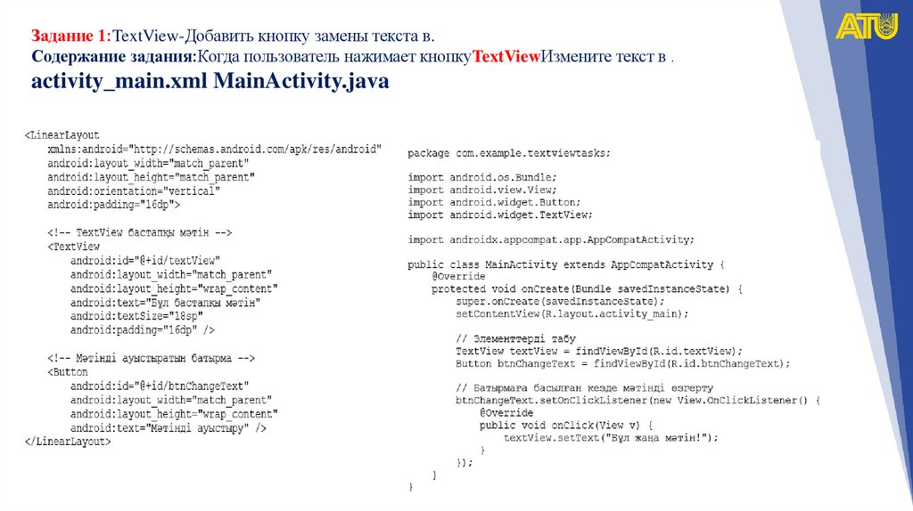 Задание 1:TextView-Добавить кнопку замены текста в.Содержание задания:Когда пользователь нажимает кнопкуTextViewИзмените текст в .