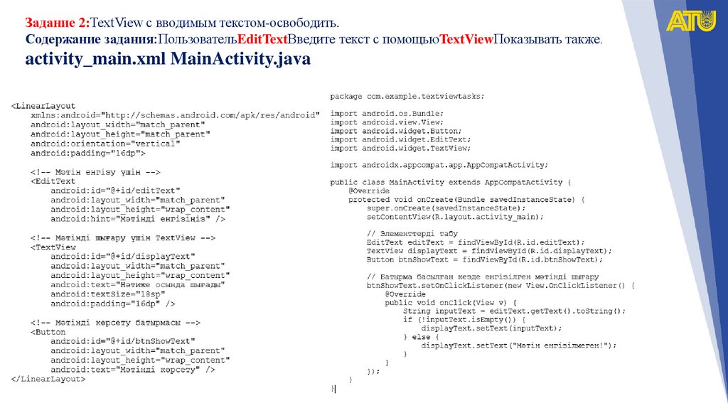 Задание 2:TextView с вводимым текстом-освободить.Содержание задания:ПользовательEditTextВведите текст с помощьюTextViewПоказывать также.