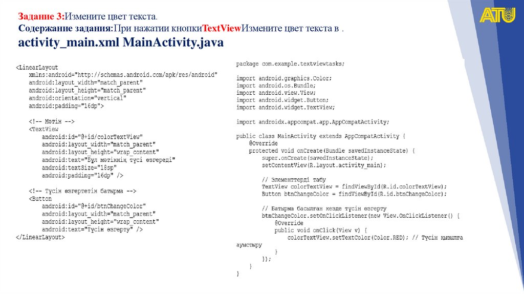 Задание 3:Измените цвет текста.Содержание задания:При нажатии кнопкиTextViewИзмените цвет текста в .